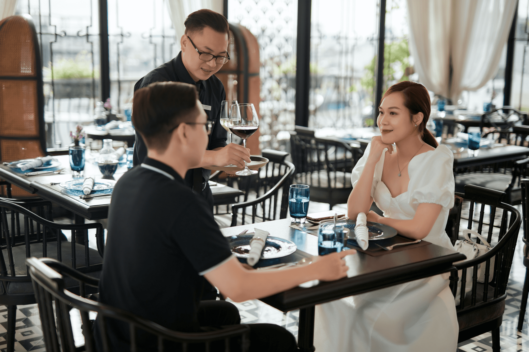The restaurant and bar area are classically styled calling to mind an Indochina area. A color palette of black, white, creams and blue-greys partners with geometric shapes of striped furnishings and square patterned floor tiles.
